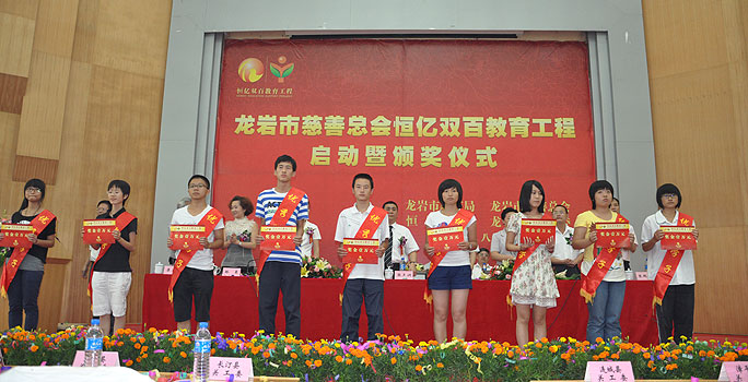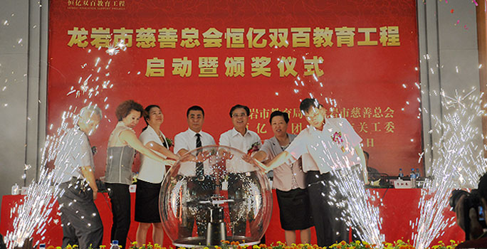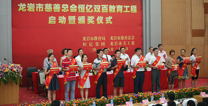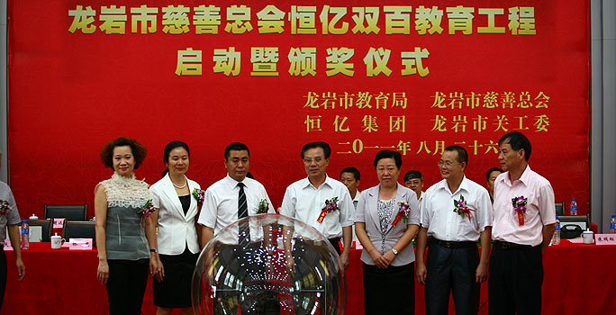 百年大計,教育為本。為獎勵樹立遠大志向,勤奮學(xué)習(xí),努力拼搏,銳意進取,立志成才的莘莘學(xué)子和獻身黨的教育事業(yè),無私奉獻,教書育人,博愛胸懷,托舉希 望的優(yōu)異園丁,從2011年起至2020年,恒億集團在龍巖慈善總會設(shè)立“恒億冠名基金”6800萬元,每年捐助200萬元,獎勵全市品學(xué)兼優(yōu)的應(yīng)屆高三 畢業(yè)生100名和全市當(dāng)年高三優(yōu)異教師100名,每名優(yōu)異學(xué)子、優(yōu)異教師分別各獎勵壹萬元,冠名為“恒億雙百教育工程”。這是恒億集團繼“恒億百村文化工 程”的慈善事業(yè)工程后,為積極參與海西經(jīng)濟區(qū)建設(shè),助推龍巖市教育事業(yè)的進一步發(fā)展,盡企業(yè)社會責(zé)任,回報老區(qū)家鄉(xiāng)人民的又一重大善舉。