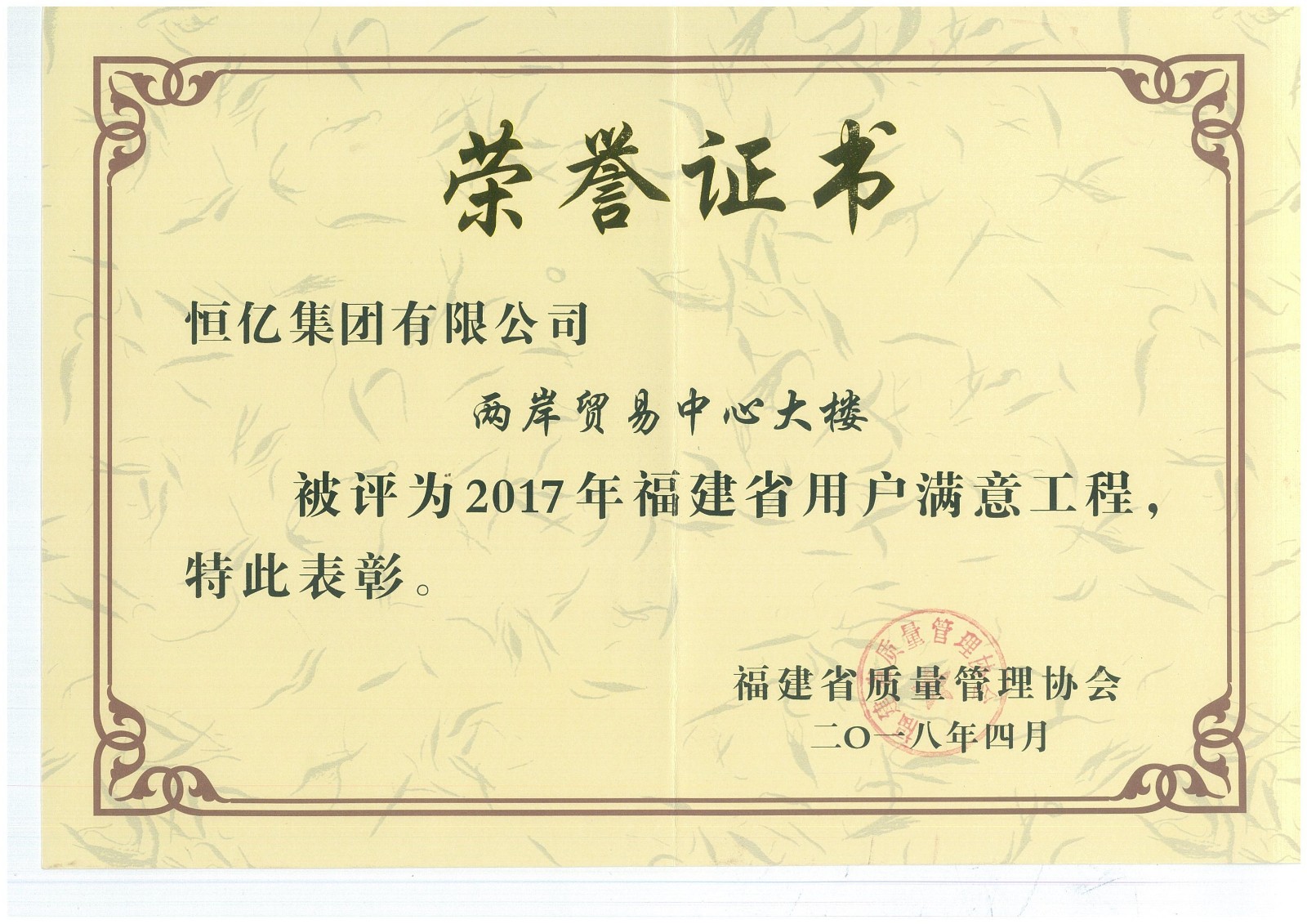 近日,由福建省質量管理協會組織的“2018年全省用戶工作會議暨推進用戶滿意工程研討會”在福州召開,會上表彰了2017年全省用戶滿意稱號獲獎的單位。我司榮獲“福建省用戶滿意企業”,承建的兩岸貿易中心大樓榮獲“福建省用戶滿意工程”。