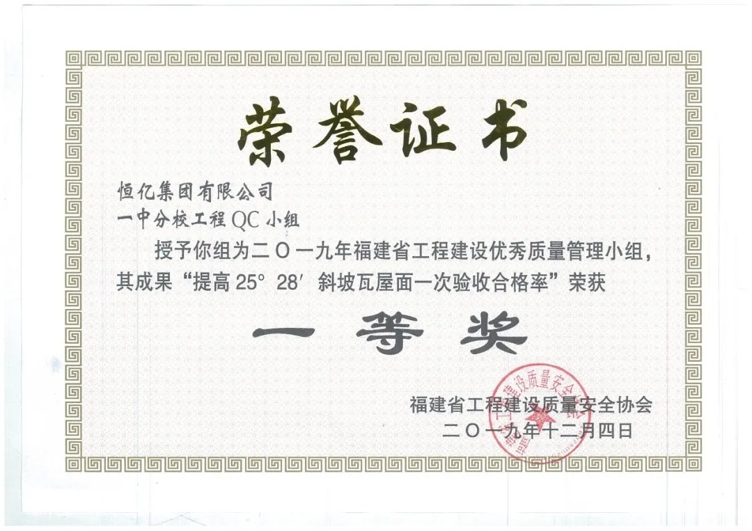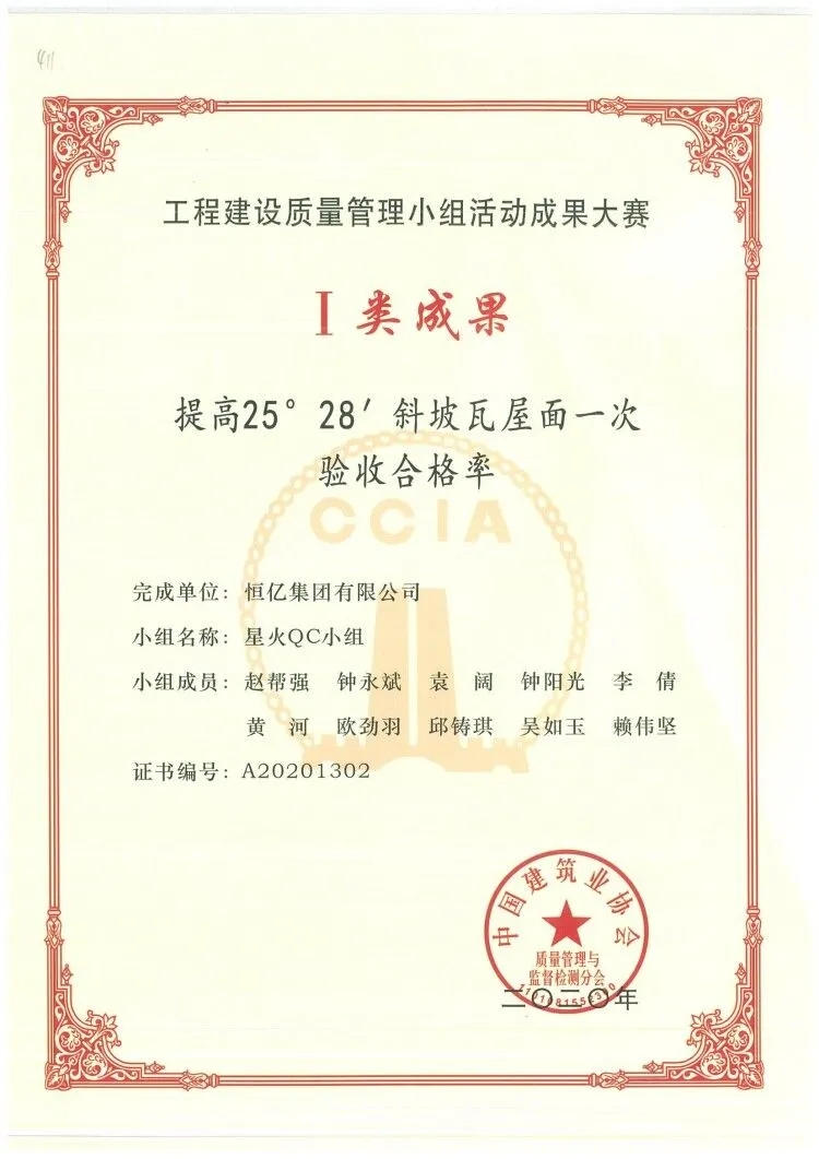 恒億建設(shè)龍巖一中分校第一標(biāo)段工程星火QC小組課題為《提高25°28′斜坡瓦屋面一次驗(yàn)收合格率》,在2020年中國(guó)建筑業(yè)協(xié)會(huì)舉辦的國(guó)家級(jí)成果大賽的評(píng)選中脫穎而出,榮獲一類成果,取得國(guó)家級(jí)QC發(fā)布一等獎(jiǎng)。