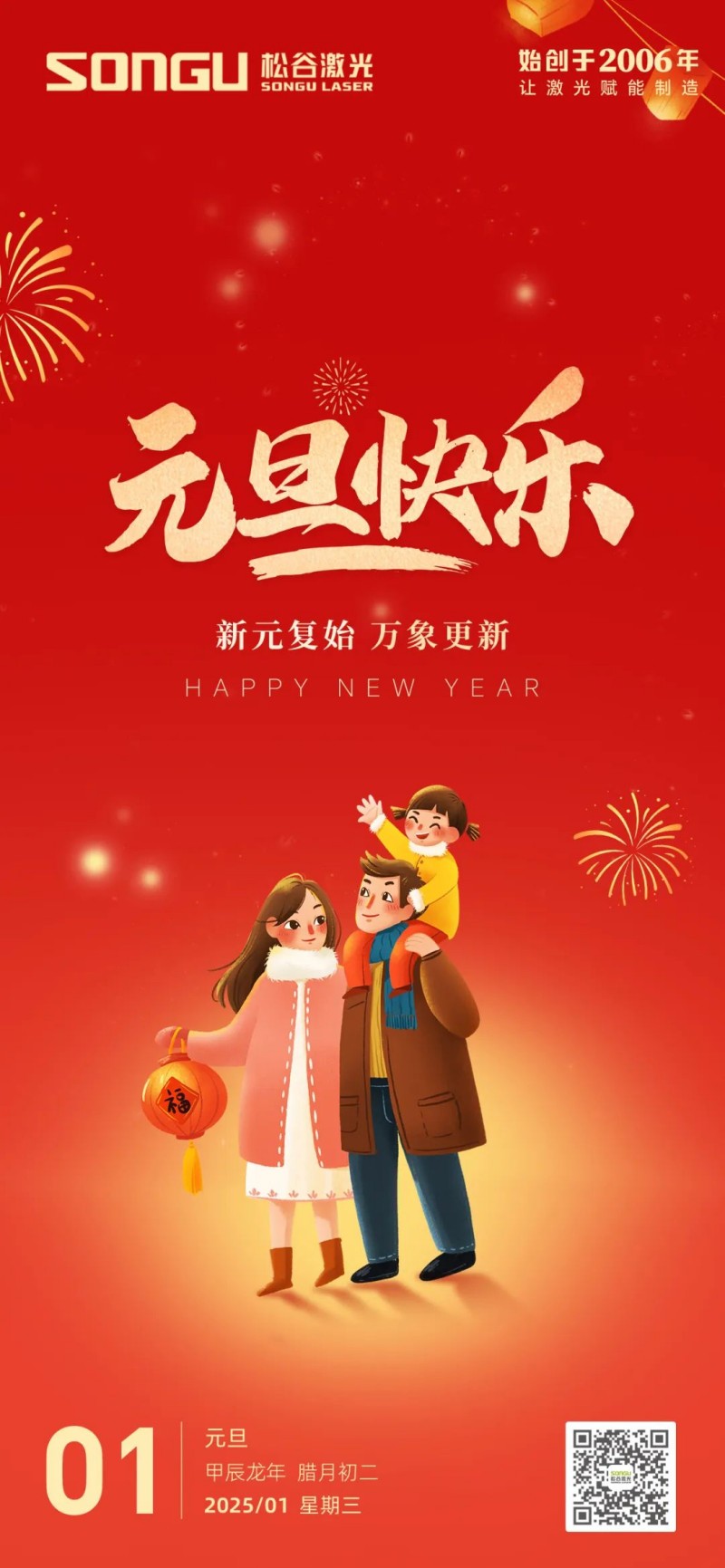 隨著歲月的腳步悄然邁進(jìn),我們滿懷激動與憧憬,共同迎來了充滿希望的2025年元旦。在這個辭舊迎新的美好時刻,松谷激光科技向全體員工、合作伙伴以及一直以來給予我們支持與信任的朋友們致以最誠摯的祝福和最深切的感謝!