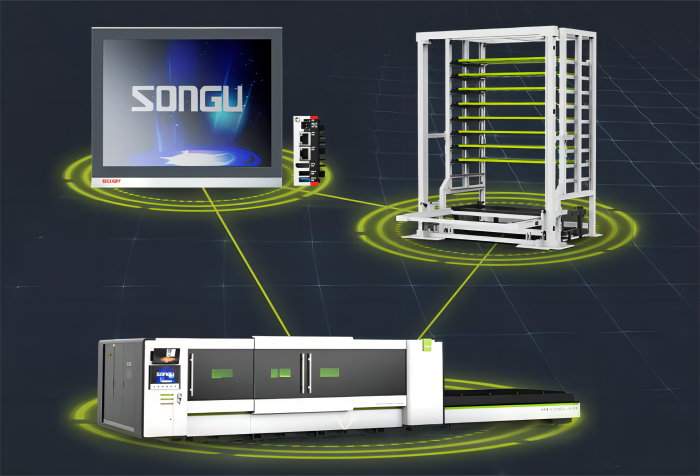 松谷柔性激光切割系統及智能倉儲系統,針對金屬工件批量切割作業時,